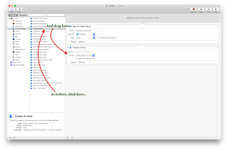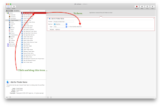 For me, the first step was to select the correct file. Since an Application will run on its own, it needs to have direction about what items to work on, and this can be done in one of two basic ways (for my purposes, anyway): I can either give the Application a file or folder to use every time, or I can have it ask me which file or folder to deal with. I chose the latter of these two, and put the “Ask for Finder Items” action at the top of the list. To do this, click and drag “Ask for Finder Items” from the second column on the left into the main workflow area on the right.