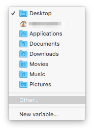 Next are the “Start at:” and “Type:” options. “Start at:” allows you to automatically set the folder where the “Open” dialog will start out. I set this to the top level folder where I keep all my Scrivener projects. If you keep yours loose in your Documents folder, say, you could select “Documents” from that dropdown menu, or whatever other folder you use for storing your documents. If your particular folder is not one of the ones listed in the menu, click the “Other…” item and select the folder where you want the “Open” dialog to start.The “Type:” option allows you to permit Files, Folders, or Files and Folders both to appear as selectable items when the action runs. If you select “Files,” then you will only be able to select files, and clicking on Folders will drill down inside the folder. If you select “Folders” then files will be greyed out in the “Open” dialog and only folders will be able to be selected. You will still be able to drill down folder levels, but any files inside folders will be greyed out and unable to be selected. If you select “Files and Folders” it will permit you to select either files or folders in the Open dialog for further processing.