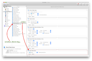 Quick aside, here: one key concept here is that this is a workflow, and that each step generally leads into the next step. Although Automator actions can be highly customized, and I will not even get into some of the more powerful things it can do, the basic idea is that there is a sequence of linked steps, each of which feeds the step after it.