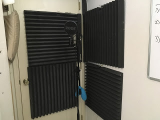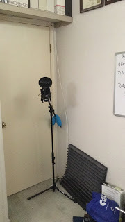 Creating a home-based location for recording is one place where you can really spend only a little bit of money and significantly improve your recordings. In my particular case, I decided to switch up the orientation of the recording area; instead of recording right in front of the computer, my office has what amounts to a small vestibule coming off the main hallway (see image to the right). It occurred to me that by closing the door (which I would need to do anyway) and putting acoustic foam and other noise-deadening materials up, I might be able to turn it into a very small recording studio. It happens that before my father passed away he had intended to turn one room (now, a bedroom) into a recording space but was never able to finish it, so there was acoustic foam tiling already in place in there (but, as I noted, it's a bedroom now and not suitable for recording space). So I started removing some of the tiles from the walls in that room and putting them up on the back of the door, and the wall to the right in the image. I wanted to try to avoid having to re-glue the panels, so I opted to use large binder clips; since the foam is very compressible, I could use the clip to hold the tile, and then place a pushpin on the wall or door from which to hang the clip. It works quite well and has significantly improved the quality of my recordings. Here are some images of the current setup:
