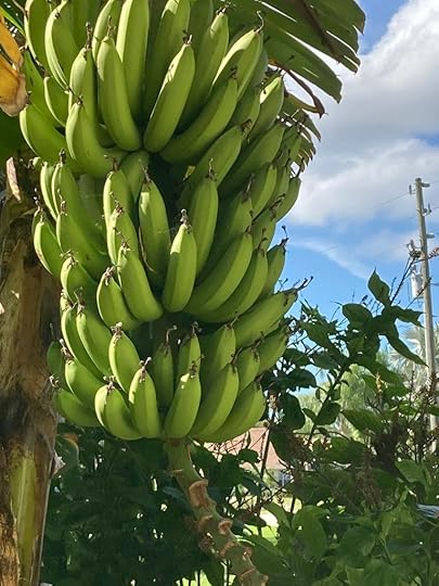 Yesterday I finally got out to look again beyond the lanai at all the flora. I needed the soothing vibrant colors and the sun after a slight accident when my slipper caught on the venetian blind and I lost my balance. Landed on my well-cushioned butt. It still hurts! My neck too. So as an exercise in appreciating what I have, I took my photo stroll. The banana tree above is in the side yard. It’s a lush yard full of palms and flowers and lest you feel my life is paradise, I ran into some trouble when minutes later I ventured out on my first solo trip to the local grocery store just down the road. All would have been fine if I had not turned the wrong way leaving the store. I figured out what I had done when I passed the paint store we’d shopped at. I knew it was the other way. So I pulled onto a side street; I knew my house was in there somewhere. I clicked on my phone map. In that nano second, I hit a mailbox which went flying everywhere.