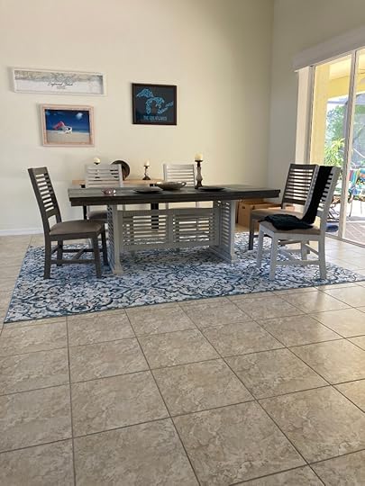When we walked on the ground level ceramic tiles (almost everywhere in our new house) we knew we needed area rugs. TBH it was a shock to Al but he soon agreed when I found a half off sale. This was before mega-inflation. I decided on three rugs to start. Dining room, living room and my office. Chatting with a friend who had an area rug in her living room, and told me a story about how she chose it, I decided to go wild and buy a rug just because I liked it. Our dining room was empty, what could it hurt?