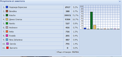 Никой не може да ме убеди, че 55000 души са се вързали на това нещо. Всеки, който е работил поне малко със сайтове, знае как може да напише каквито желае цифри в анкетата. Фрапантното разпределение на гласовете показва този факт. Водещият тук Крисчо има 39 000 (!) гласа. Вторият, в случая аз - 9000, третият - 2900. Такава колосална разлика не може да бъде реален вот, особено като погледнем и, че номинираните автори са световно неизвестни и имат публикации само в сайтове като СтиховеБГ или някакви лични блогове.