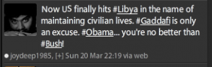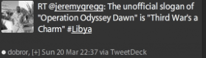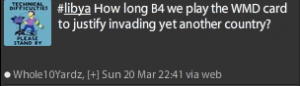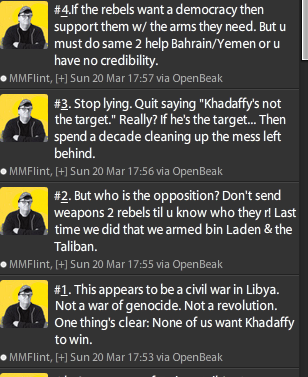 Some have charged that the Libya action has a Neoconservative political odor. But the Neoconservatives hate the United Nations and wanted to destroy it. They went to war on Iraq despite the lack of UNSC authorization, in a way that clearly contravened the UN Charter. Their spokesman and briefly the ambassador to the UN, John Bolton, actually at one point denied that the United Nations even existed. The Neoconservatives loved deploying American muscle unilaterally, and rubbing it in everyone's face. Those who would not go along were subjected to petty harassment. France, then deputy secretary of defense Paul Wolfowitz pledged, would be "punished" for declining to fall on Iraq at Washington's whim. The Libya action, in contrast, observes all the norms of international law and multilateral consultation that the Neoconservatives despise. There is no pettiness. Germany is not 'punished' for not going along. Moreover, the Neoconservatives wanted to exercise primarily Anglo-American military might in the service of harming the public sector and enforced 'shock therapy' privatization so as to open the conquered country to Western corporate penetration. All this social engineering required boots on the ground, a land invasion and occupation. Mere limited aerial bombardment cannot effect the sort of extreme-capitalist revolution they seek. Libya 2011 is not like Iraq 2003 in any way. MORE…