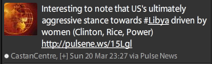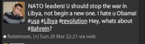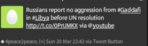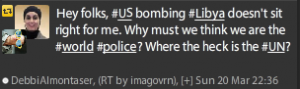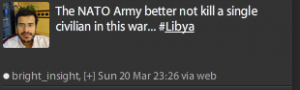 …To these considerations one should add the following: it is nonsensical, and an instance of very crude "materialism," to dismiss as irrelevant the weight of public opinion on Western governments, especially in this case on nearby European governments. At a time when the Libyan insurgents were urging the world more and more insistently to provide them with a no-fly zone in order to neutralize the main advantage of Gaddafi's forces, and with the Western public watching the events on television — making it impossible that a mass-scale slaughter in Benghazi would go unseen, as it was so often the case in other places (like the above-mentioned Hama, for instance, or the Democratic Republic of the Congo) — Western governments would not only have incurred the wrath of their citizens, but they would have completely jeopardized their ability to invoke humanitarian pretexts for further imperialist wars like the ones in the Balkans or Iraq. Not only their economic interests, but also the credibility of their own ideology was at stake. And the pressure of Arab public opinion certainly played a role in the call by the Arab League of States for a no-fly zone over Libya, even though there can be no doubt that most Arab regimes were wishing that Gaddafi could put down the uprising, and thus reverse the revolutionary wave that has been sweeping the whole region and shaking their own regimes since the beginning of this year….