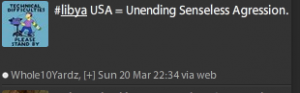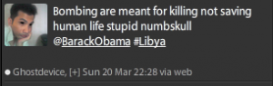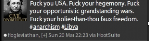 …Can anyone claiming to belong to the left just ignore a popular movement's plea for protection, even by means of imperialist bandit-cops, when the type of protection requested is not one through which control over their country could be exerted? Certainly not, by my understanding of the left. No real progressive could just ignore the uprising's request for protection — unless, as is too frequent among the Western left, they just ignore the circumstances and the imminent threat of mass slaughter, paying attention to the whole situation only once their own government got involved, thus setting off their (normally healthy, I should add) reflex of opposing the involvement. In every situation when anti-imperialists opposed Western-led military interventions using massacre prevention as their rationale, they pointed to alternatives showing that the Western governments' choice of resorting to force only stemmed from imperialist designs….