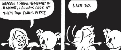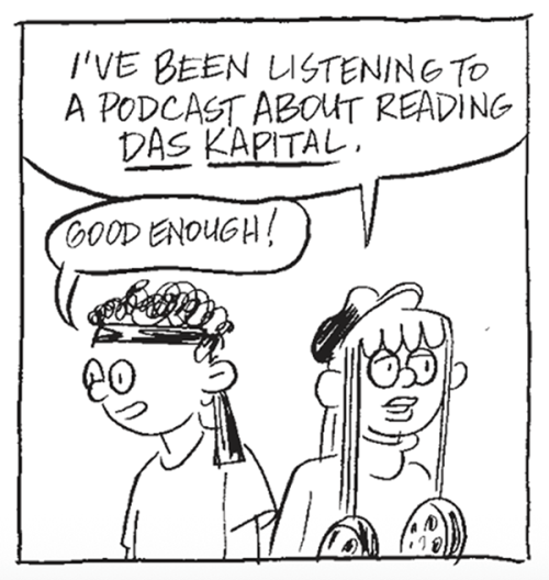 When you’re a young artist, with more ideals than money, your day job a prime indicator (barista, bookseller, movie usher), you know what you’re in for: your life is full of like-minded souls; and, heck, maybe you’ll get caught up in some clumsy attempts at overthrowing capitalism. That’s the vibe to Reel Politik, the hilarious comic strip by Nathan Gelgud, about a ragtag group of employees hanging on by their fingernails at a local indie movie theater. You can catch up with the latest post on Gelgud’s Instagram and you can enjoy a new collection published by Drawn & Quarterly.