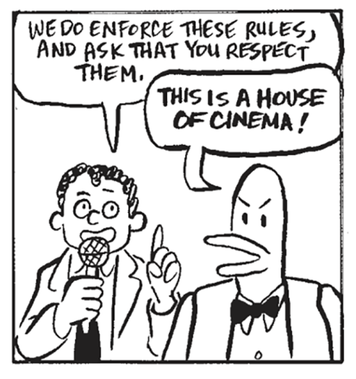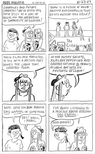 A really good comic strip takes on a life of its own and is open to various interpretations. Gelgud, in the tradition of great cartoonists, is a keen social observer, ready to poke fun at the culture-at-large and its critics. A case in point is well into the narrative, once the movie employees have taken over and freed cinema of its capitalist shackles. Sandra is rejoicing over how cinema is now free and For The People. No one is enslaved to the strictures of the past–the hierarchy imposed by the Criterion Collection. Someone points out a man who has been put in a cage. Sandra shrugs and admits some people are less equal than others. The man in the cage is serving time for having scratched a copy of a beloved classic film! We’ve been brainwashed by a consumer culture but we’ve also been brainwashed by a slogan-heavy activist class.