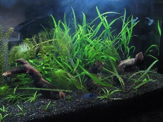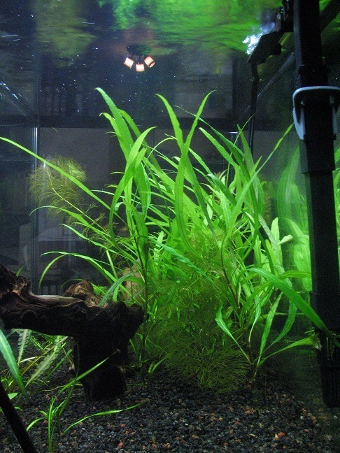 All plants, fish and the driftwood are from Blue Fish Aquarium in Grand Rapids, MI which is the only place I purchase livestock from. Substrate is Carib Sea Eco-Complete – highly recommended however, when their package says your water will turn cloudy they LIE! It doesn’t turn ‘cloudy’ it turns into a darned mire and looks like you just siphoned water into your tank from some ancient mucky swamp. It takes about 24 hours for it to settle and finally get ‘cloudy’ and that’s with filters running. Another note, some people rinse it – please don’t do that. Part of the reason of getting this particular substrate and ones like it is for the beneficial bacteria impregnated within.