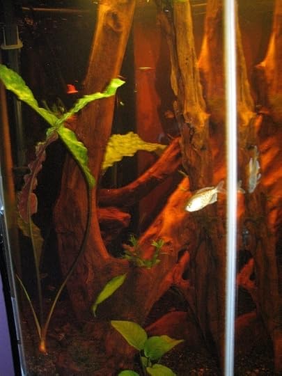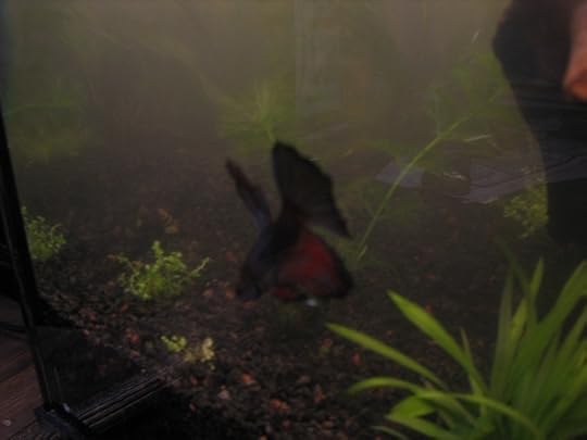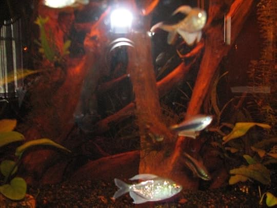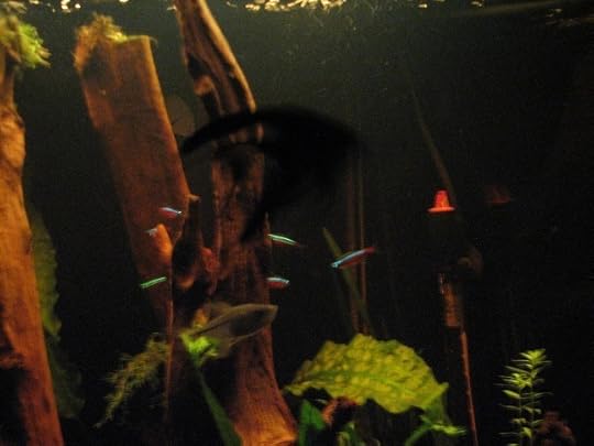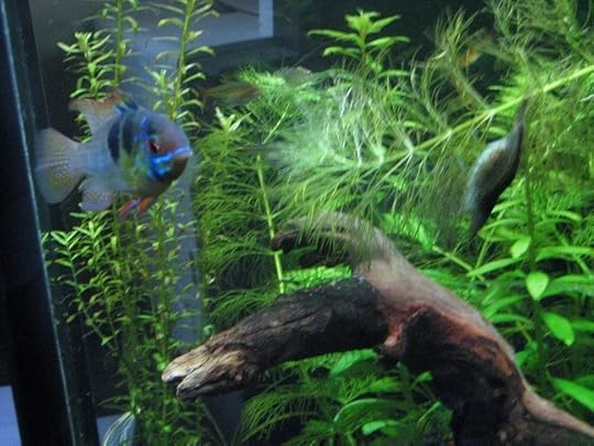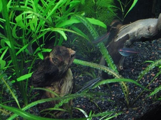 After multiple attempts to get a decent picture of Ramiel, the black angel fish, this is the best I could do. He just fidgets too much and his dark mahogany coloring is difficult to capture. Along with him are a diamond and the cardinal tetras.