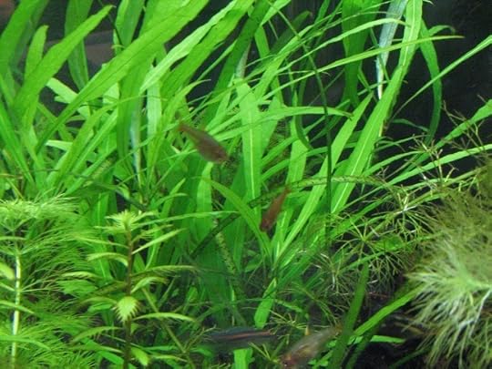 Here’s the ember tetras and a stray glow light tetra, hanging out in the forest.