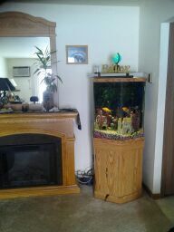 It had blue, pink and white rocks with lots of artificial buildings. Since brown doesn’t go with my bedroom decor, the stand and edges of the tank are now a metallic pewter with silver swirls. After cleaning the daylights out of the tank with a water & vinegar mix, we thoroughly rinsed it and had to reseal all the corners because the gentleman scraped all the silicone off at the advice of VIP Pets *grimace*, then we set in the corner of our bedroom.