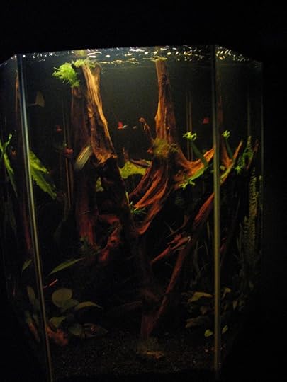 This is a brighter pic of the front, visible from the bed and middle of the room. There’s a better image of the diamonds and emperors, plus the cardinal tetras are getting some action at the top rear. Also visible are the crypt usteriana which are also doing stellar (they’re the big long leaved plants to the left and rear – the deep red at the bottom of the leaves (not visible in the pic) is fantastic!