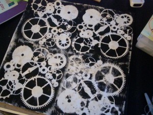 I don’t have a lot of supplies so I went to the local scrapbooking store and found a stencil of gears (around $5). I figured for that price I could learn something.