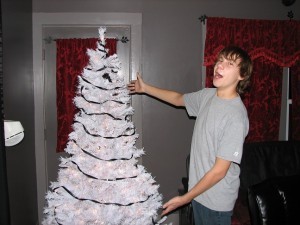 (That’s our son Gabe, magician extraordinaire, pretending he made the tree appear out of thin air!)
