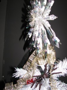 This one is my favorite – it just looks like a Christmas decoration. I took this picture before the beads were threaded on the end of the ribbon. I used clear pony beads as accent.
