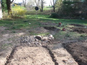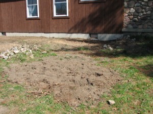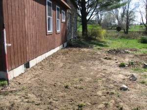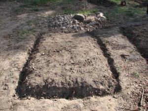 This is the eastern border of the cemetery area after several tillings. The soil was predominately clay so to lighten it and provide better drainage, we added peat moss, organic matter (leaves from last fall), a few cart loads of sand and a top layer of compost. After tilling those in until they were quite well mixed, we turned in some rocks of various sizes by hand.