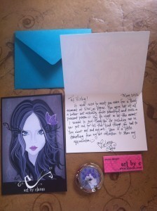 The woman on the right is Elaina, and she couldn’t have been more gracious when I accost– erm. Approached her. She and her girlfriends just looked so cool hanging at the bar, and I had to stop to compliment them and get my picture taken with her. Anyhoo, we’ve struck up a correspondence since and she surprised me with this gift in my P.O. Box:
