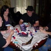 Just a little something for you to hang onto … or fritter away in a game of chance, like my friend Theresa can be seen doing here (note our friend Sleepy Mac keeping tabs on the soul chips. The bastard.):