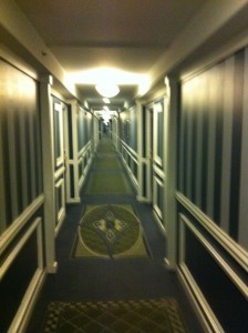First of all, is this the freakiest, most Shining-esque hallway you’ve ever seen or what? I swear the damned thing lengthened as I walked down it. The faster I walked, the faster it grew. And the blurriness isn’t even due to craptastic photo-journalism. That’s how the hallway looked, no lie.
