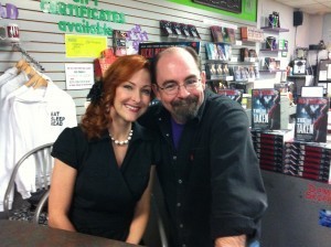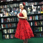 Now I’m en route to DARK DELICACIES, in Burbank/LA. I’ve never been to this indie store before, so I’m excited to sign there. It’s also the first store sponsoring a rockabilly dress up contest, so I’m going to try to perfect my victory rolls as soon as I hit the hotel. I also just found out that the Bettie Page store is just down the street from said hotel, so I foresee a visit there in the next day or so. My reader Jessica V (from yesterday’s post) may be there, and if you remember she recreated Kit’s dress from the cover of THE TAKEN. I need to do my best to be worthy of that.