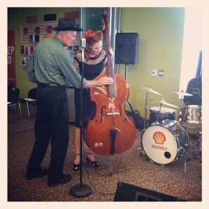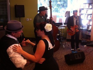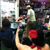 Redondo Beach was also the second stop sponsoring a rockabilly dress up contest, but we’ll get to that in a minute because the real star of the show was the live rockabilly band, Seatbelt, who were awesome enough to play for a half hour before the signing. Tell me this doesn’t look like the hippest book signing you’ve ever seen: