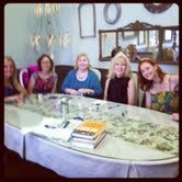 Sorry it’s fuzzy, but as I’m IN the pic, it’s obviously not my fault. But here’s Deb Coonts, Pam Palmer, Kerrelyn Sparks (WHOM I KNOW, PEEPS), Diane Kelly, Moi, and Lorraine Heath, whom I’m pulling on, but she really doesn’t want to sit next to me, so she’s pulling back. So no pic for you, Lorraine.
