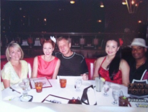 Friend and fellow native Las Vegan, Stacey, showed up and recommended an old-school steakhouse, The Smoke House, just across the street from WB studios, and since Jessica and I were all dolled up, old Hollywood style – and ravenous – we all went together. She’s with her husband, Eric, who was so fun, and I’m with James … but I’m kinda with Stacey too as I’m grabbing her thigh under the table, which is why we’re smiling so big.