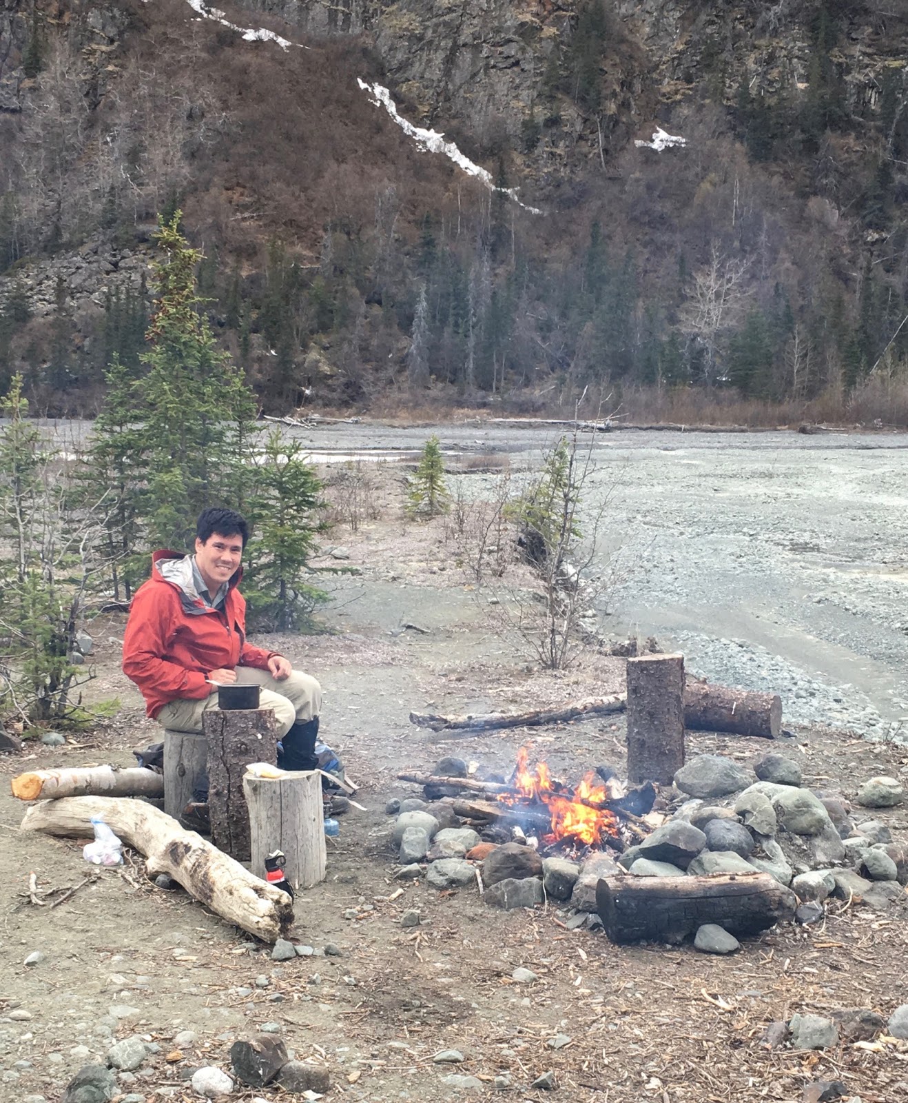 Kevin got us more water from the river. (We treated it, just to be careful.) My ankle was bothering me a bit at this point, so I was sitting by the fire, being lazy.