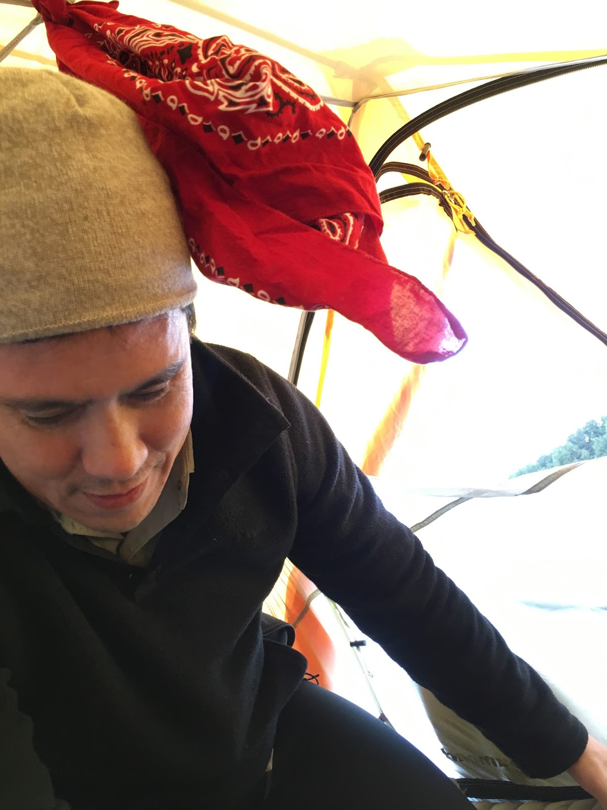 It was probably around 8 or 9 PM when we climbed into the tent. The floor of the tent was icy-cold, but the Thermarests did wonders to combat that feeling. We wrung out our socks and other wet things and hung them from the ceiling.