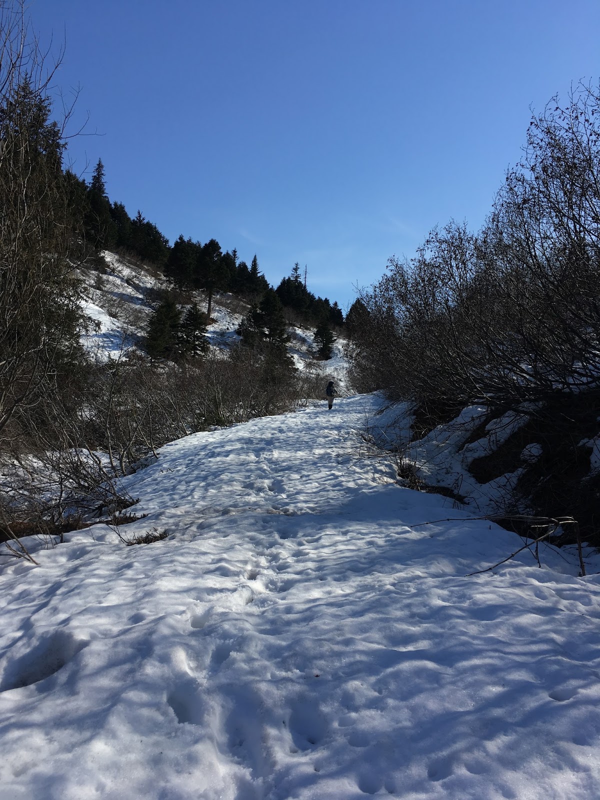 Eventually the path was all snow, deep snow, maybe three feet deep, crusty on top but soft underneath. We started doing some post-holing. (Post-holing is when you step on what you think is hard snow, then one leg plunges in, and you’re briefly stuck there, and it’s hard to step out without post-holing the other foot.) At this point, we’d gone so far and exerted ourselves so much that we were determined to continue on. It was really hard work, and I was really looking forward to it ending, but I was also glad to be there, and curious about what was going to happen next.