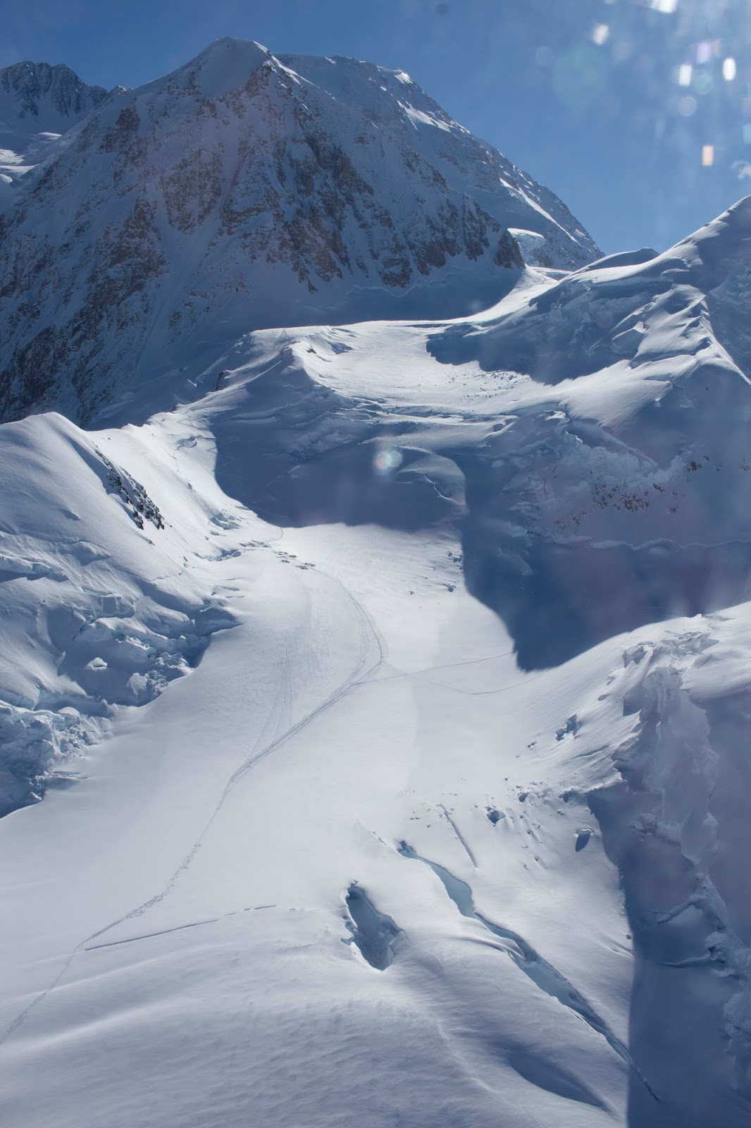 Those colorful dots are tents of climbers on their approach to Denali base camp. See the lines in the snow? Base camp is along the path to the left. The dark shape at the top is the shadow of the mountain.