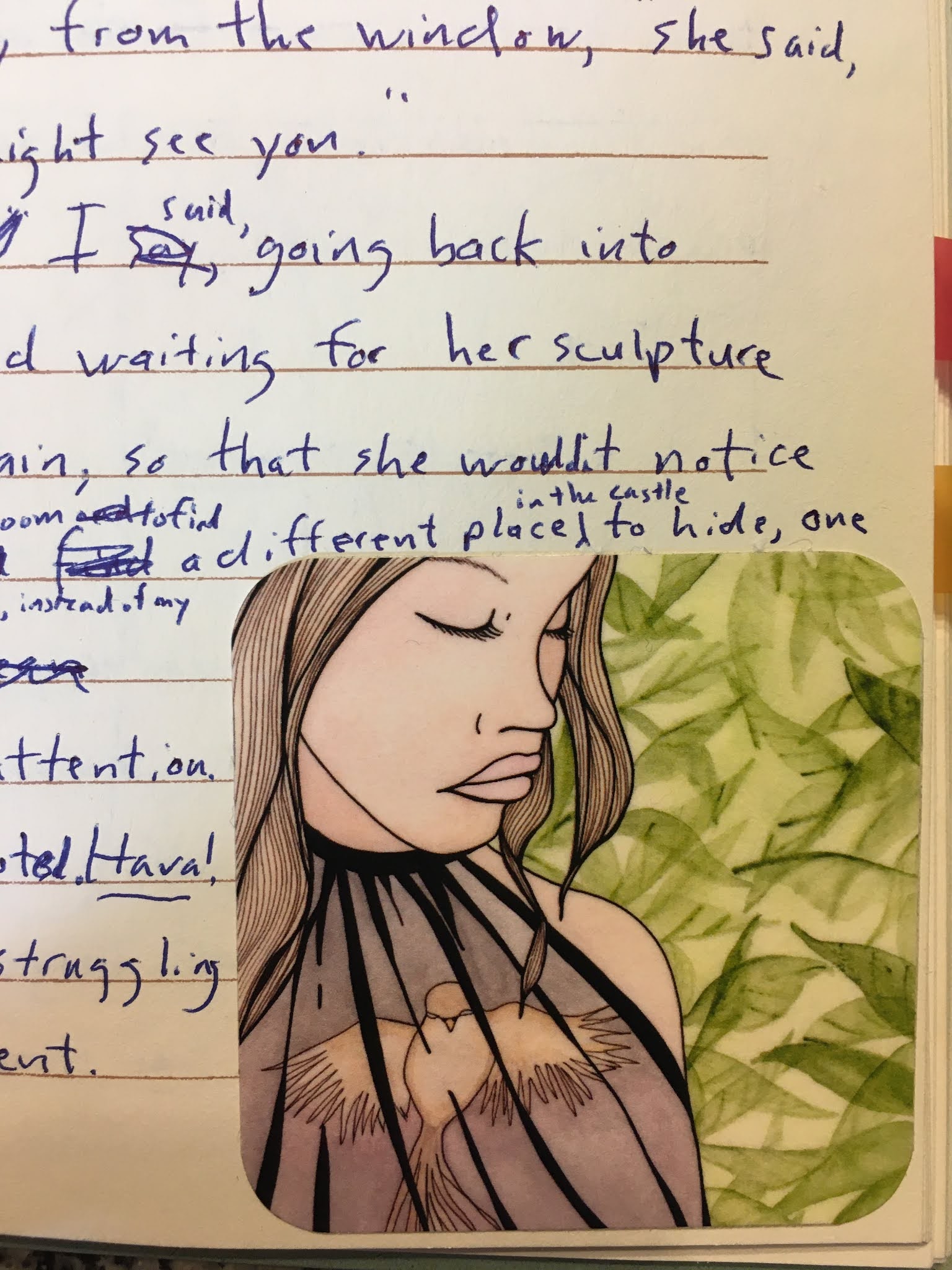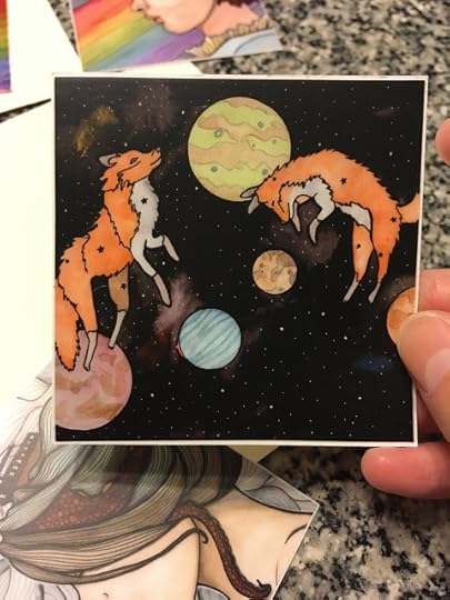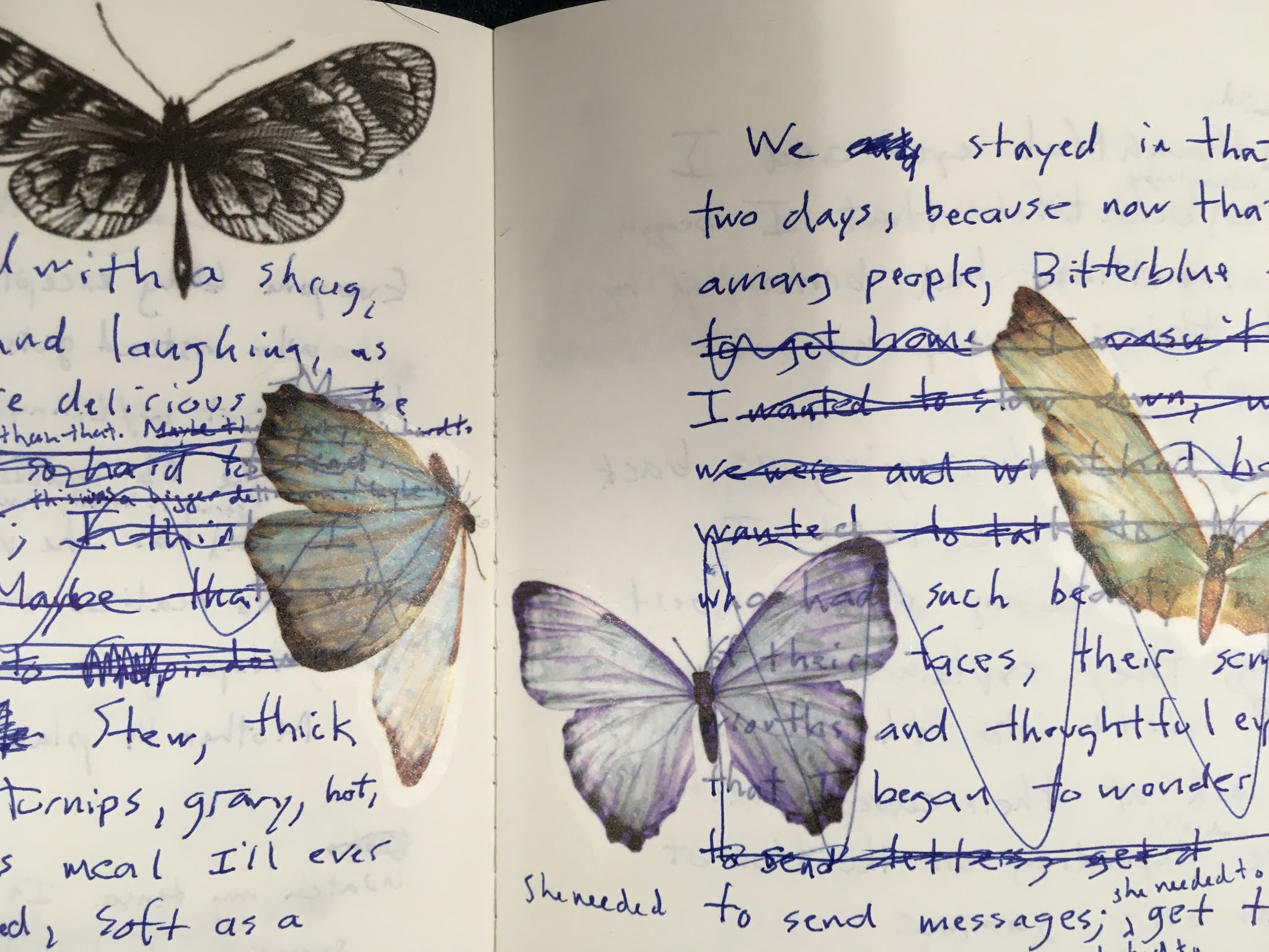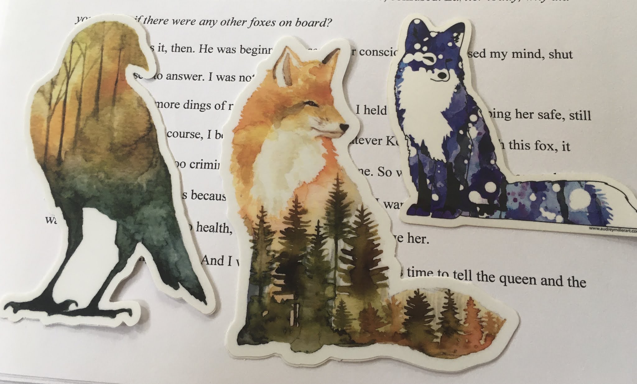 I've been hunting for stickers that feel like my books. Stickers that match my characters, my plot, the feelings that imbue my story. Then, as I write, I plop the stickers onto the page… And it helps. It gives me ideas; it slows me down, so that my writing is more thoughtful; it gives me joy.