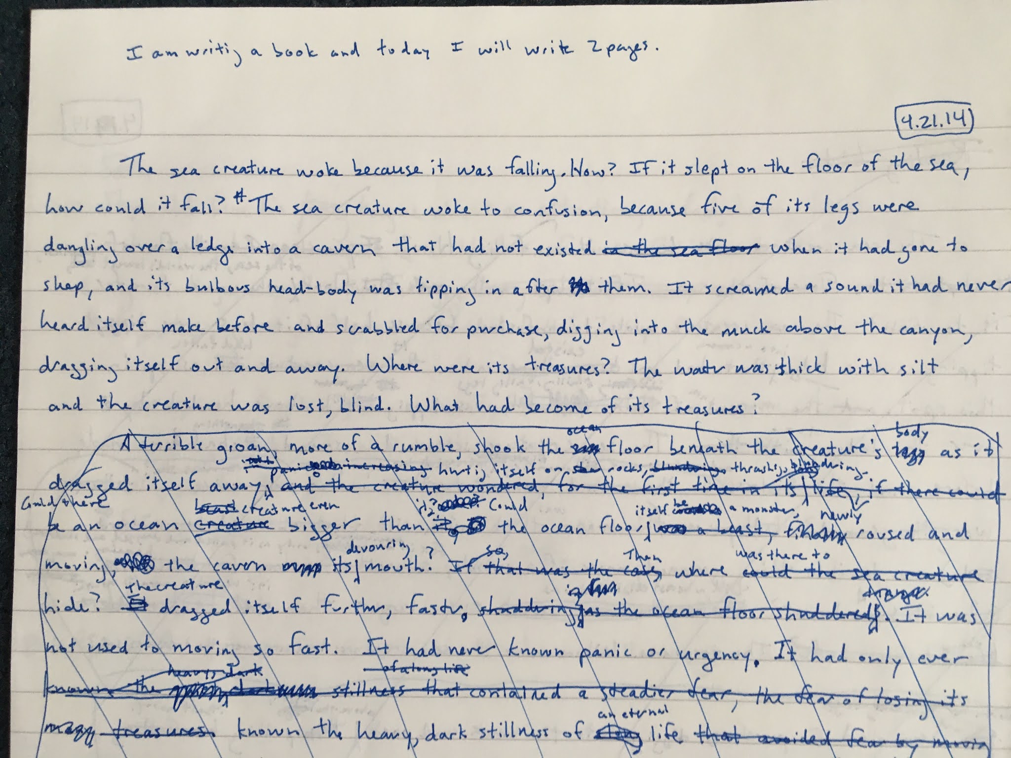 Next up, here's a picture from the first page of my first draft, started on April 21, 2014. I wanted to share this because at the top, I've written, "I am writing a book and today I will write 2 pages." That's something I learned from Linda Sue Park, who gave a speech about writing once years ago in which she talked about the emotional weight of trying to make progress through such a long and gigantic project. You don't sit down thinking to yourself, "I need to write this entire book." You sit down thinking to yourself, "today I will write two pages." When Linda Sue said those words, it changed my writing life. So much pressure disappeared! (By the way, if you enjoy seeing pictures of my notebook, you might like the detailed post I wrote about writing Bitterblue.) (Oh! And if you read that post, then read the writing carefully below, you will notice that ONCE AGAIN, I tried to write an earthquake into a book. Like the earthquake in Bitterblue, this Winterkeep earthquake did not make it through to the final draft. Why am I obsessed with earthquakes?)