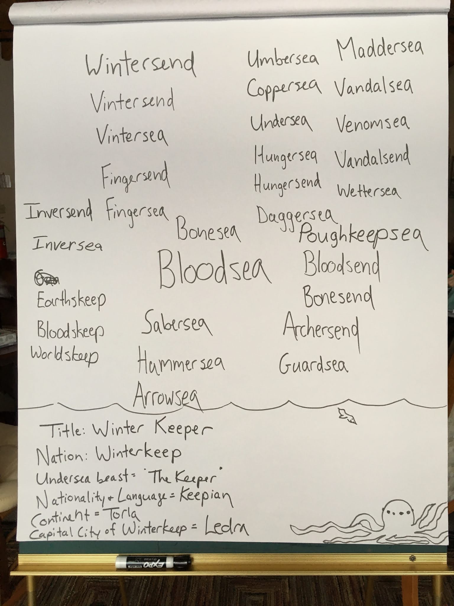 Finally, years later — almost 3 years ago, in February of 2018 — I was far along in the writing process, but I still hadn't figured out what this place was called, what this book was called, what the undersea beast was called…. At a writing retreat with friends, I kidnapped this gigantic easel notepad thingamajig and started writing down possibilities. Everyone voted. You'll note that "Winterkeep" isn't even on this list (though some pretty silly things are; I wrote down every possibility, no matter how bad), but you'll also see that I was getting pretty close to "Winterkeep!" I don't remember exactly, but I must have come up with "Winterkeep" while we were at dinner one night, and everyone agreed it was the winner. (For a while after that, I was calling the book Winter Keeper, but when it came time to decide for sure, my team at Penguin decided to go with Winterkeep, so that the title would line up nicely with the other single-word Graceling Realm titles.)