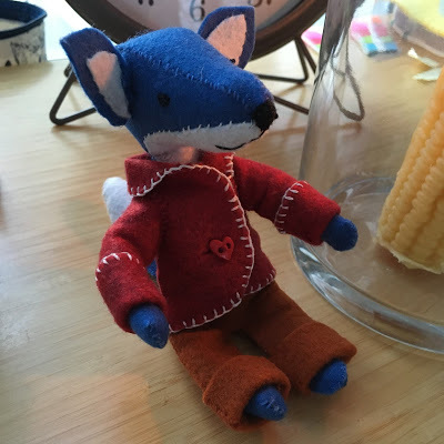 Finally, these days, most of my announcements and musings take place over on Twitter, which means that readers of the blog may be missing things… And I feel it's imperative that none of you miss being introduced to my writing companion, February Spiffington. I made him myself, using . Of course I substituted blue felt for his body, because naturally, like all Keepish foxes, he is not red, but blue.