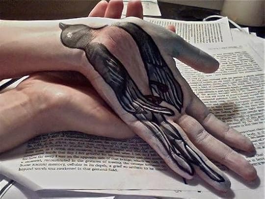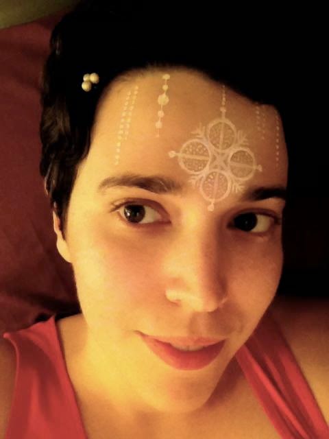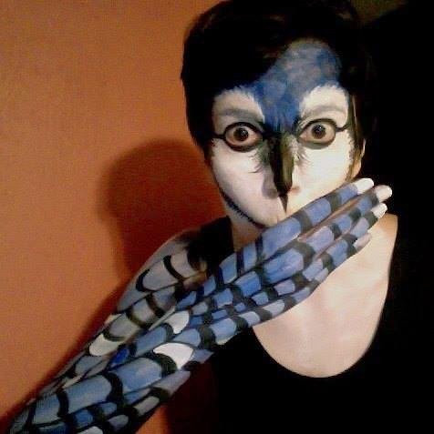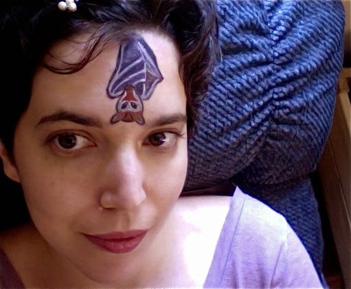 "...And I do it because it's such a challenge to take an image in my head and put it on a body, because there's all this stuff in the way...eyebrows and noses and a mouth, and the surface curves and won't cooperate...usually I start out with a certain inspiration and then I actually start to work with the body and it completely commandeers my process. Like that caribou I painted was supposed to be a scrabble board, but my leg objected. And the fruit bat was originally going to be a floral pattern based on a piece of fabric I bought. So I like being limited by the odd surfaces a body provides, because it produces surprises and there's a built-in respect for the body as the boss of the mind instead of the other way around. But it's also extremely frustrating. I am sometimes quite happy with my final product, but the first half of the process is normally awful and I feel like I will never make it work and I should just give up and take a shower."