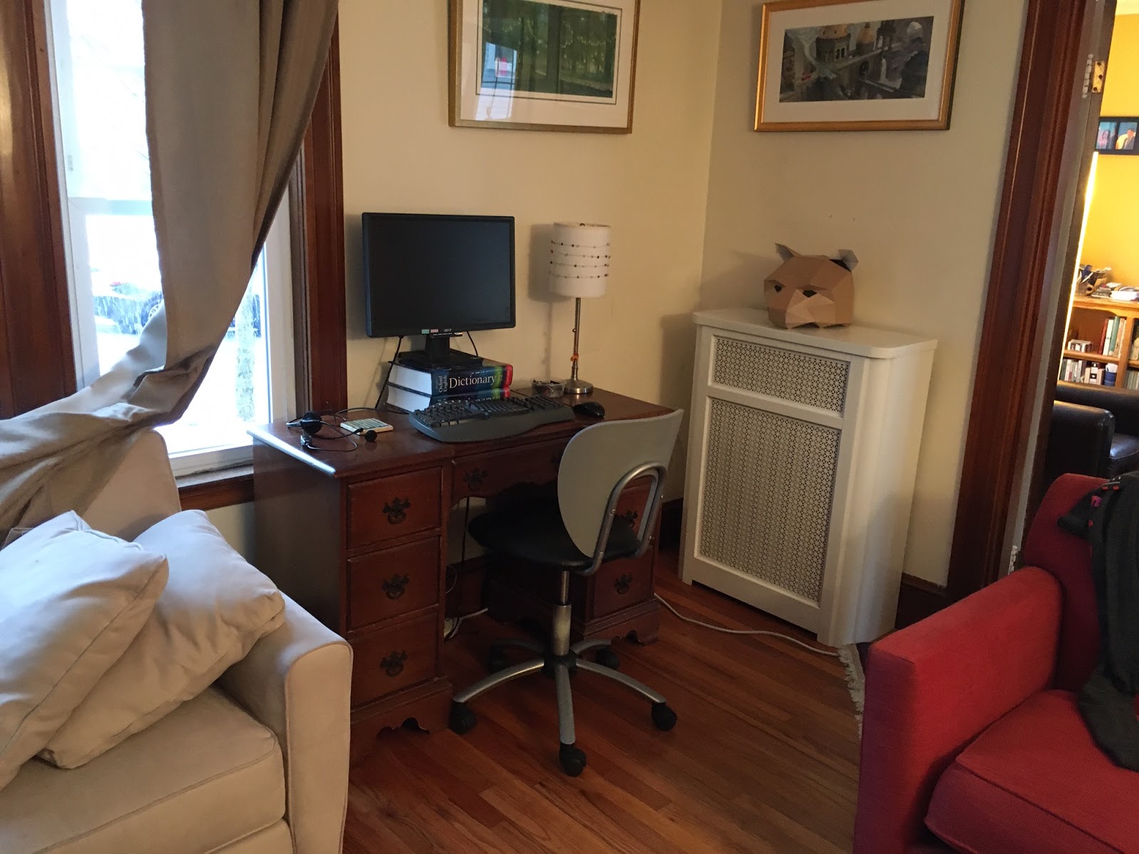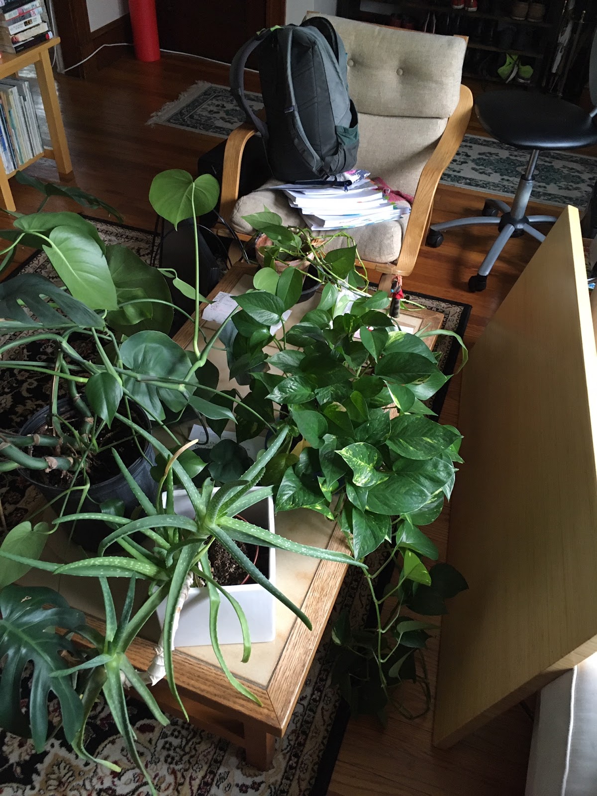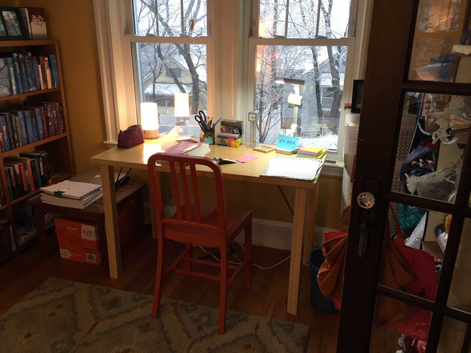 I have an office outside the home where I can, in fact, self-isolate, but when the shelter-in-place order came down in Massachusetts, we moved me home. It involved lugging home a table; a chair; a computer; my fancy printer; every size, shape and color of pen, post-it note, and index card imaginable; many piles of crap; and many plants. Inconceivably, this was only two days ago! It feels like weeks ago.