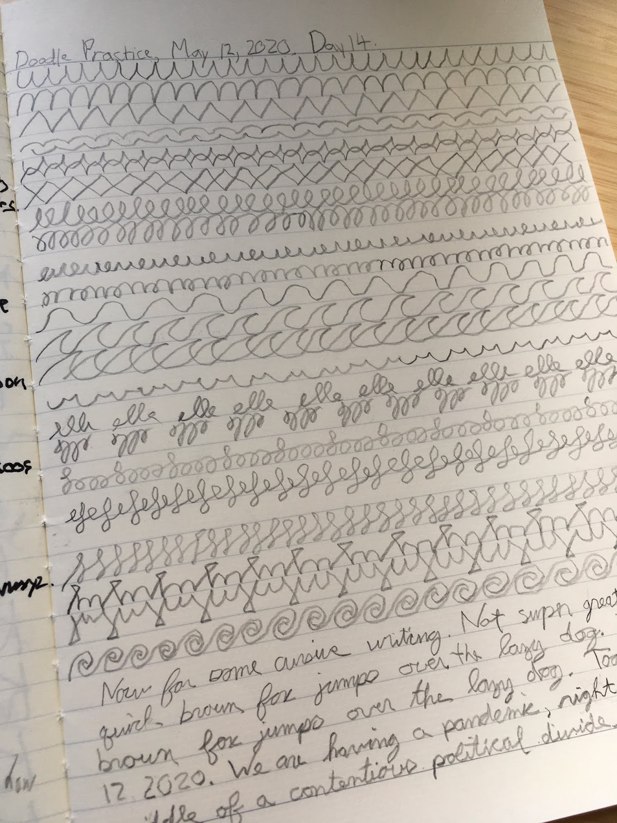 Then I do a page of doodles, based on a penmanship worksheet I found online (with maybe some cursive opining at the end). One of the main challenges is making sure I'm using my fine motor muscles — writing by moving my fingers and hand, NOT my entire arm. It's tempting to use the arm, but the whole point is to develop control in those little muscles.