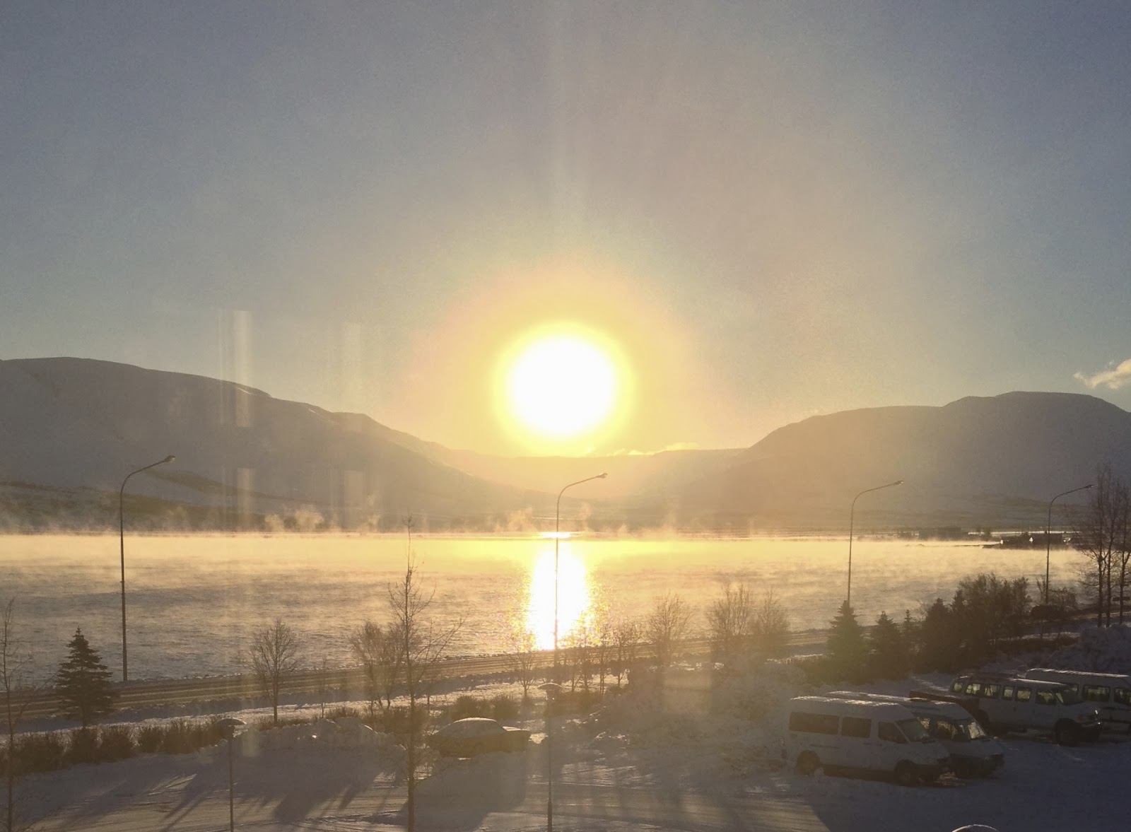 Another view from my windows – the 11 o'clock sun, rising over misting water.