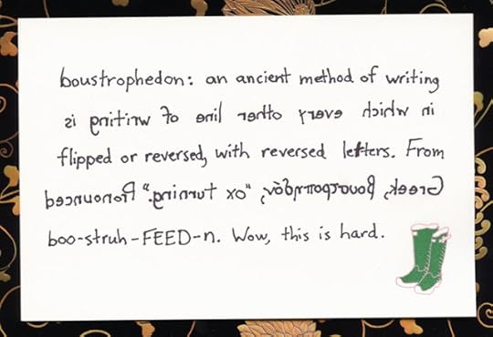 Boustrophedon [boo-struh-FEED-n], from the Greek βουστροφηδόν, βοῦς (bous) meaning "ox" and στροφή (strophē) meaning "turn": An ancient method of writing in which every other line of writing is flipped or reversed, with reversed letters. The way oxen would write, you know, if they were turning back and forth in the fields in order to write, rather than in order to pull the plow. :D?