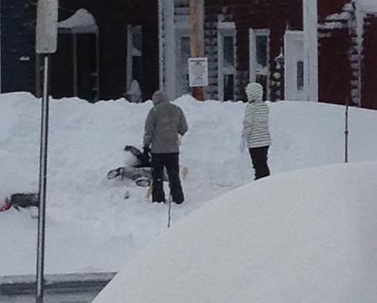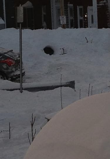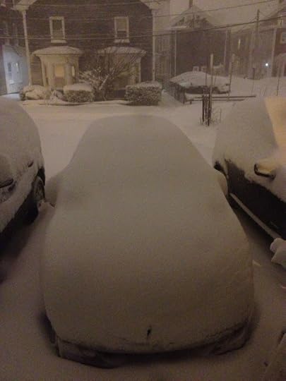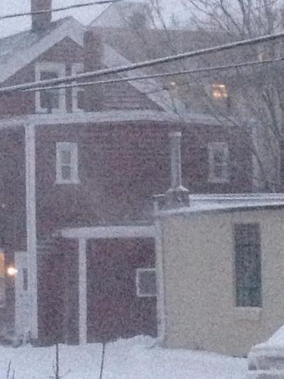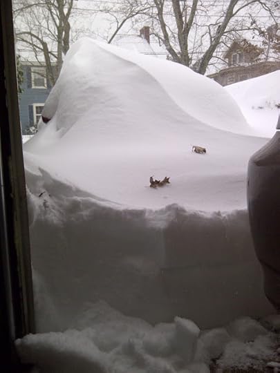 It's been snowing for about 25 hours. I keep thinking about Almanzo Wilder and Cap Garland and hoping they're okay.* Here is the view from codename: Apocalyptica's garage in Swampscott. That's her buddy Margaret's car, in case you didn't recognize it as such.