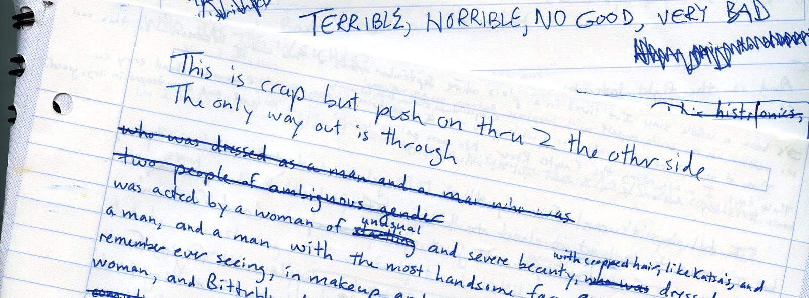 These notes are not born of modesty or low self-esteem. They are born of the simple truth that a first draft is crap; a first draft is terrible, horrible, no good, very bad; and the writer, moving forward while leaving a stream of detritus in her wake, CAN GET VERY DISCOURAGED. But she keeps moving, because, as Robert Frost said, "The best way out is always through."