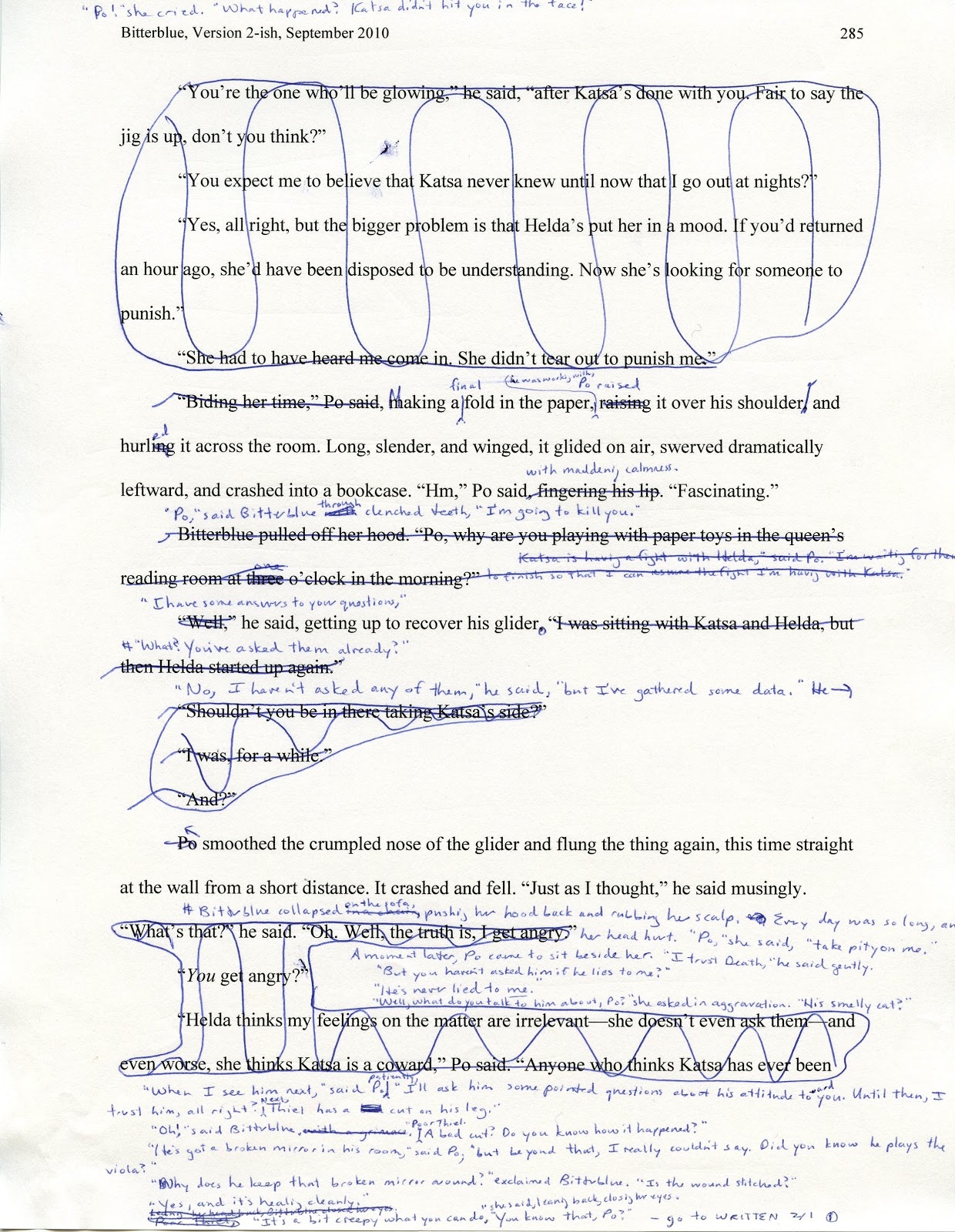 Here's the reason this ended up being the best thing my editor could have said. Within that 800-page mess, the final story was all there. If you were to read Bitterblue's first draft, you would come away with essentially the same story a person reading the final book comes away with. But there was a lot of extra, unnecessary stuff in there, too; I'd spent a lot of space working things out for myself that didn't really need to be worked out for the reader. There were extra characters who could be consolidated into fewer people to simplify things. There were plot complications that didn't need to be so complicated. The themes were buried in crap; they weren't shining. There was an earthquake! (Literally. One plot point was an earthquake.) The story I was trying to tell didn't need an earthquake.