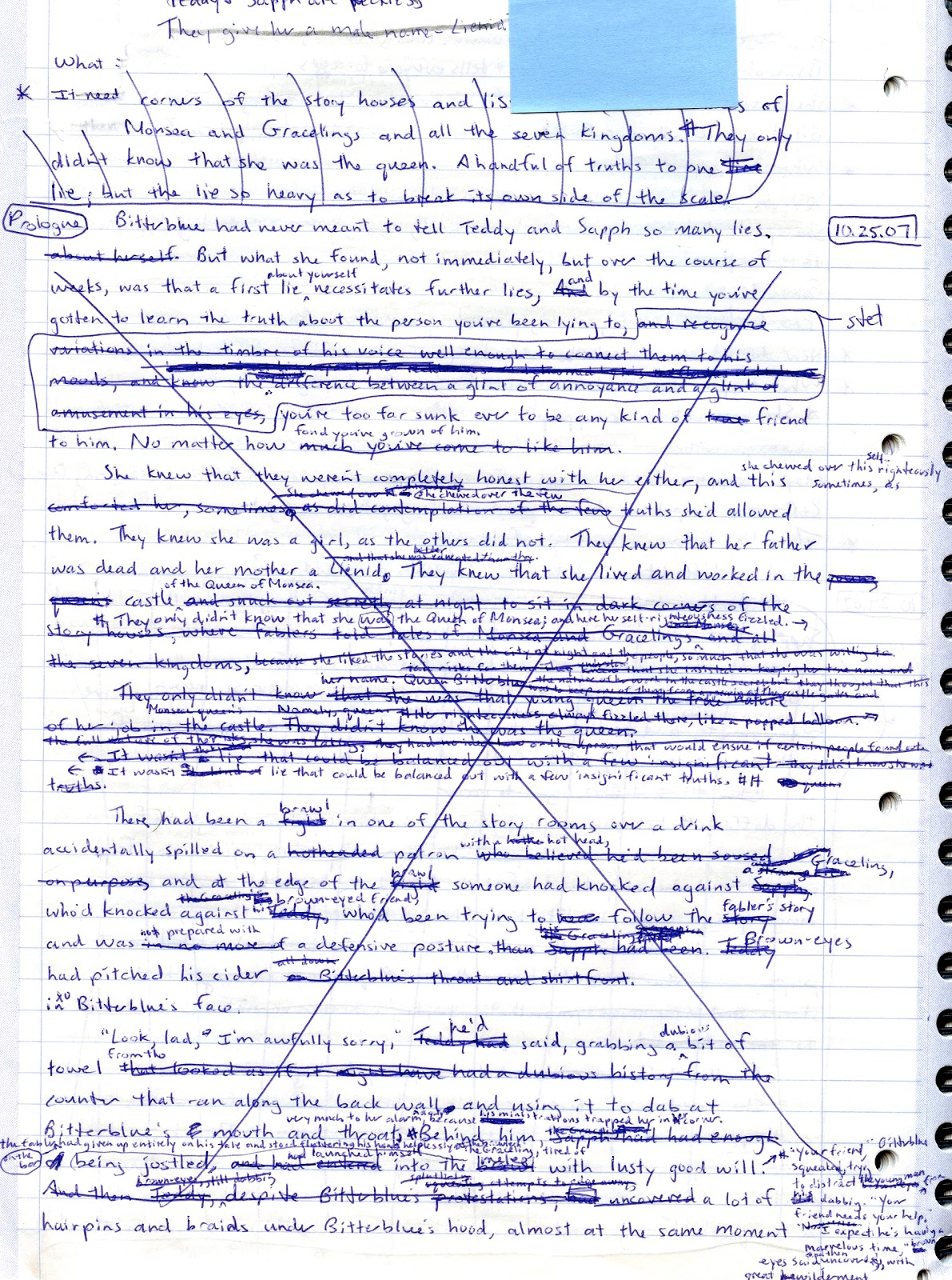 The date is December 2, 2010 -- more than three years since I'd started writing. Can you read what it says? It is almost word for word the way the final version of Bitterblue opens. I feel like this is an important point: it wasn't until I'd spent three years writing a mess of a draft that I figured out how Bitterblue needed to begin.