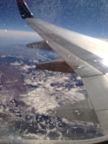 At 32,000 feet, there are ice crystals on my window and we're flying above snow-covered peaks. Yet the sun through my window is so relentlessly hot and strong that I have to keep the shade down, and when I touch it, it burns me.