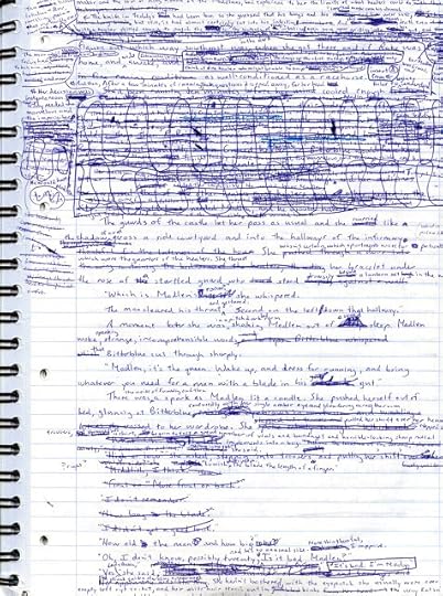 Above is the first page of the first draft of Bitterblue. Note that the date is October 25, 2007. Also note -- if you've read Bitterblue -- that this is not how the final book begins. And also that not a whole lot from this page made it into the final draft. What you see above is fairly typical: I write, I scratch out a word here and there, I scratch out a line, I change things; then I put it away for the day, come back the next day, realize the entire thing is crap, and cross the whole page out with a big X. Below is another fairly typical page: