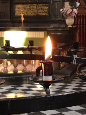 a candle with the altar in the background