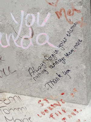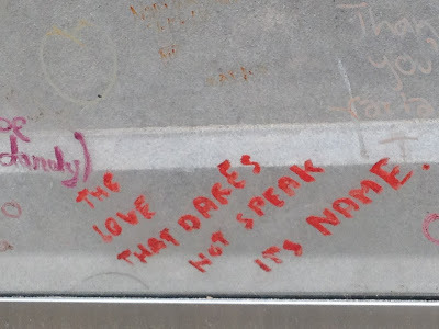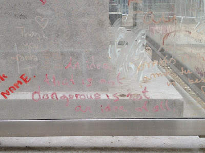 To protect the monument from enthusiastic visitors who show their love for Oscar Wilde through defacement and vandalism :), a glass partition has been placed around his grave. People use pen, crayon, lipstick, chalk, whatever, to honor him with messages, many of which are Wilde's own words, or close to them.