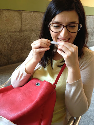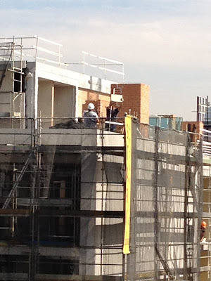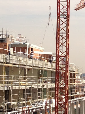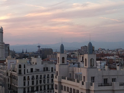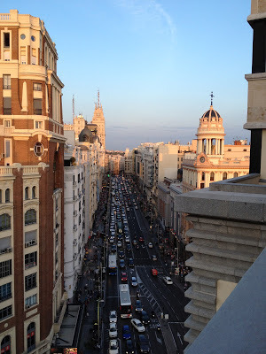 This seems like an appropriate first post for Madrid: my lovely editor Patricia and I are sitting on the rooftop terrace of my hotel. Across Madrid's gorgeous Gran Via, some men are doing construction -- can you see the beam hanging from the crane and the two men under it?